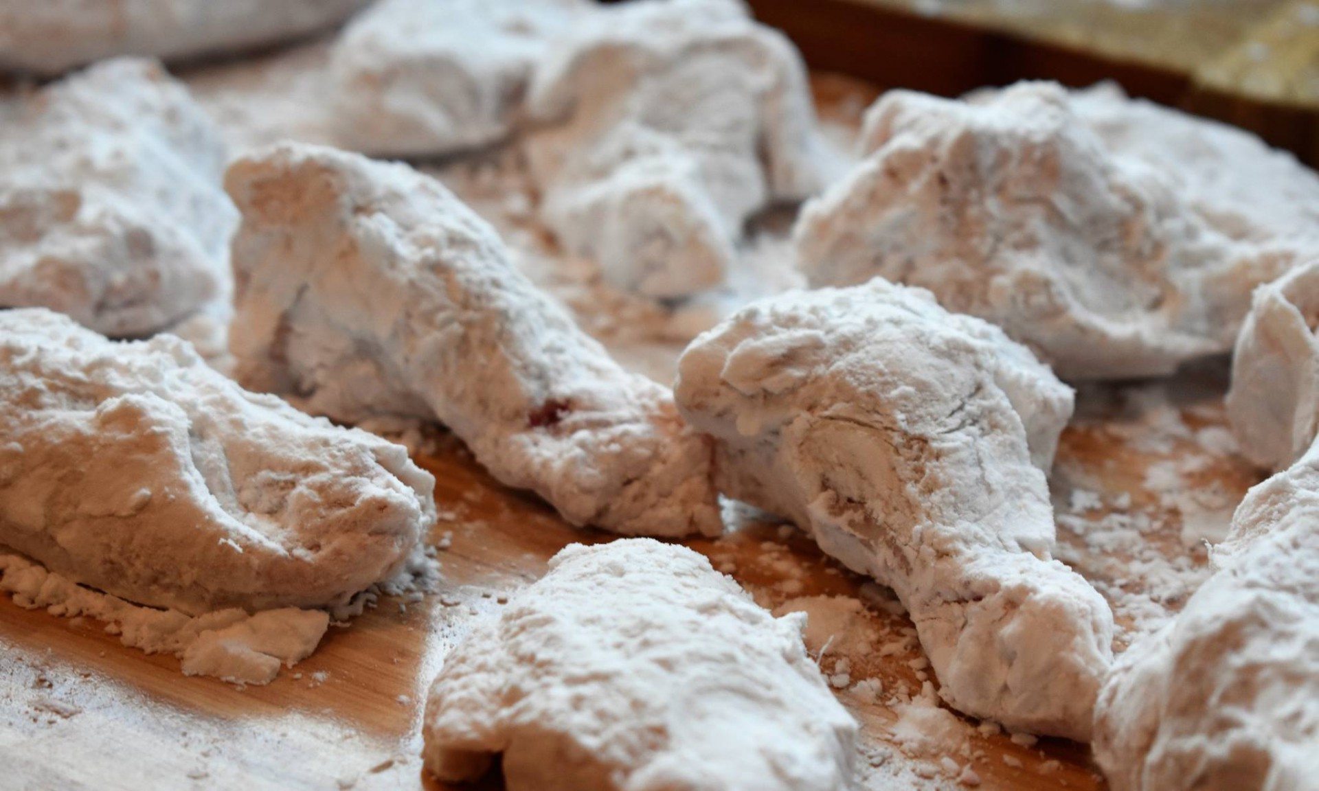 Najpierw skrzydła (te od kur bez antybiotyków najlepiej) na części - stylem łodzi motorowej - tniemy po stawach. Przepłukać wodą, odkapać i jeszcze wilgotne - bez przypraw jakichkolwiek - do mąki ZIEMNIACZANEJ. Grubo w tej mące i do w gorącego oleju (180 stopni) - kilka minut niech w nim popływają. Stara zasada - smażyć małymi porcjami. Po pierwsze żeby się nie posklejały, a po drugie za dużo na raz powoduje gwałtowne ochłodzenie oleju i efekt uderzenia gorąca bierze w łeb.